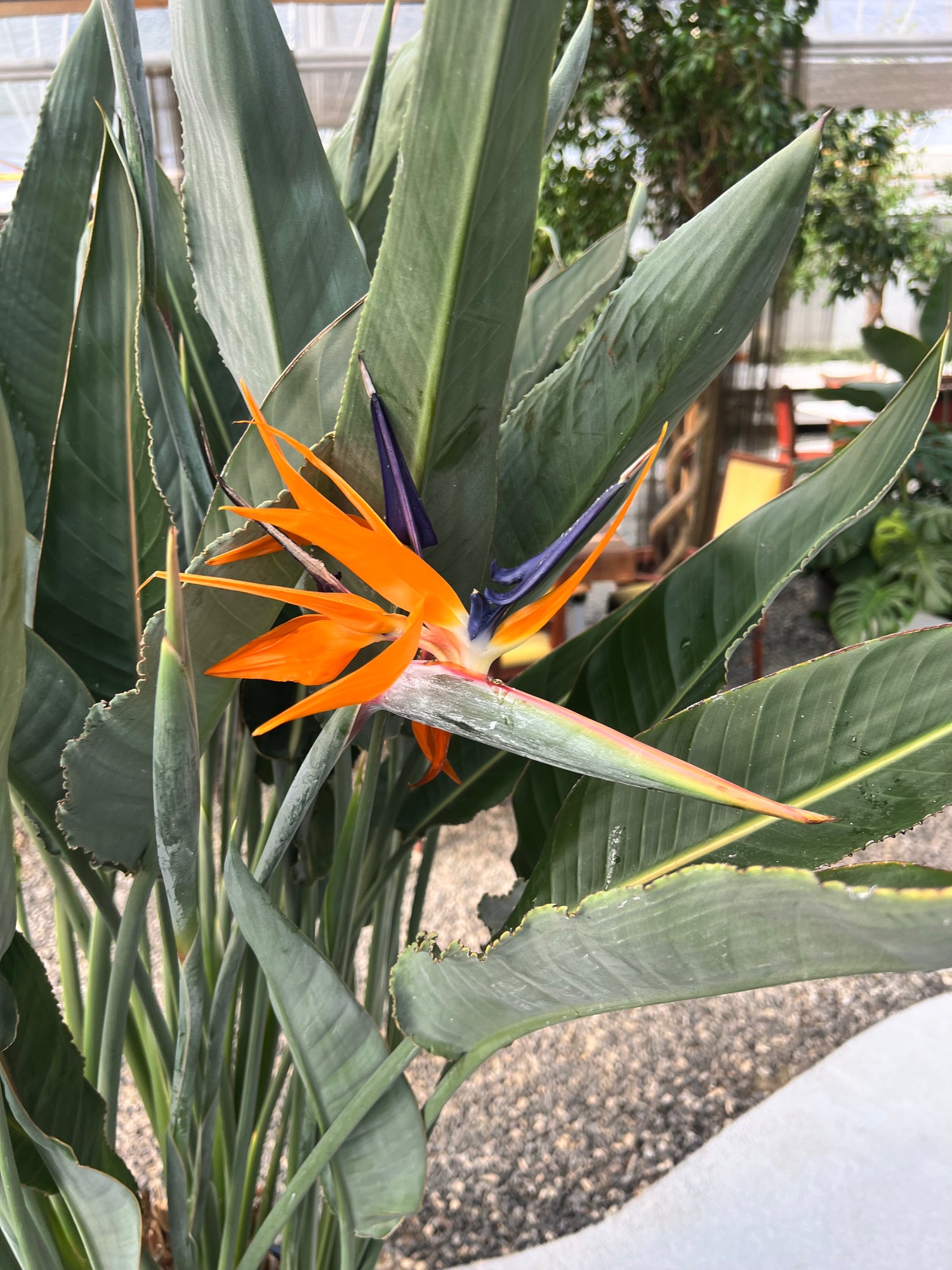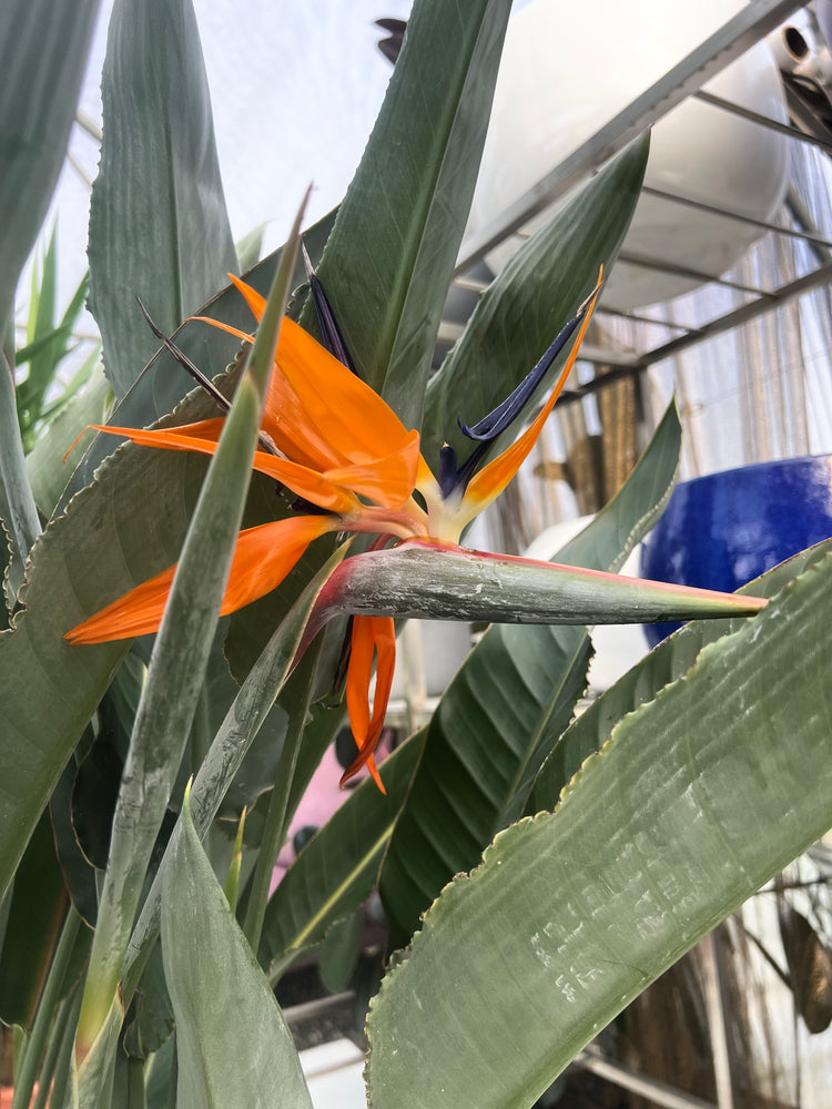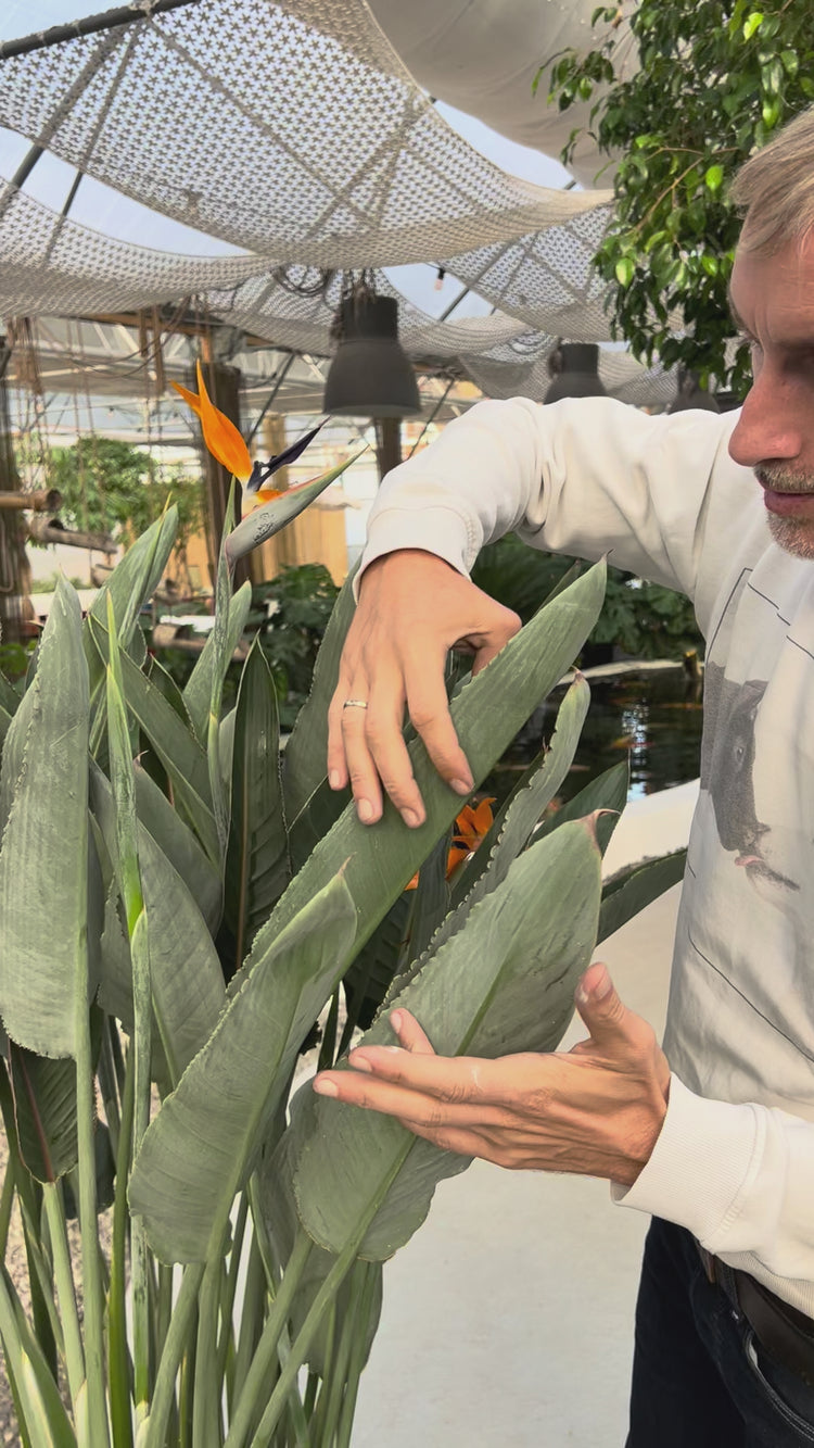 Aspect: Un exemplar matur de Strelitzia reginae, cu boboci și flori,este o plantă tropicală spectaculoasă, caracterizată prin: